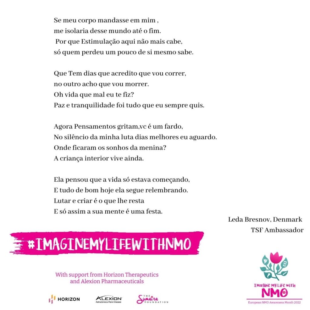 Being diagnosed with NMO was one of the darkest moments of my life, as I am sure it was for many of the beautiful souls that I’ve had the pleasure of meeting who share this journey with me, but NMO Awareness Month gives us the opportunity to show the world, and each other, that there is light in our lives, that we are a strong, resilient bunch! A real community!
