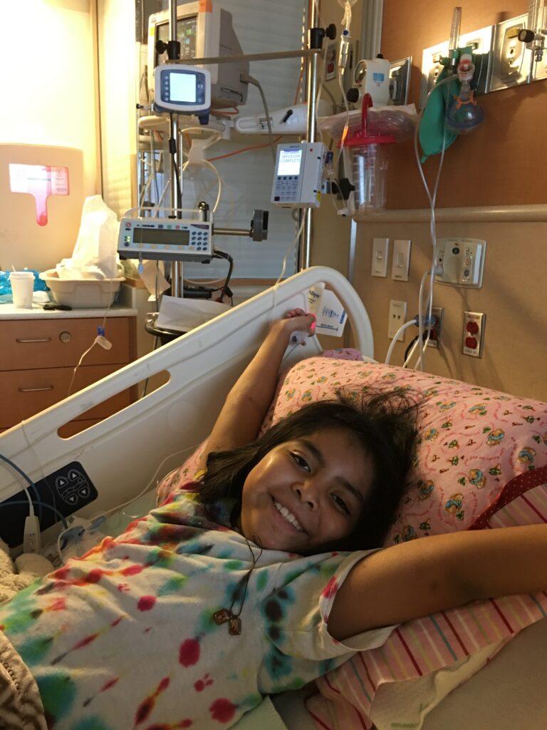 Bella’s condition continued to deteriorate over the next few days and her symptoms included an increase in vomiting, fever, high heart rate, blurred vision, fatigue, and weakness on her left side. The doctors no longer thought she had pancreatitis, but they still could not figure out what she had. We all knew we needed answers and needed them fast. At this point, we were surrounded by family and friends and people wanting to help in any way they could. The next few days were the most terrifying days I have experienced as a parent. My youngest daughter, my baby girl, was so sick laying in her hospital bed as I reassured her, sang to her, tried to make her comfortable, prayed, and told her a million times to fight and that as her mom I would fight right along with her as well as her dad, brother, and sister. I kept telling her that in this family we win together, lose together, love and fight together. Bella was vomiting every 30 seconds, had high fever, high heart rate, blurry vision, fatigue, weakness on her left side, and developed a bad case of hiccups that would cause her to choke when she was trying to vomit.