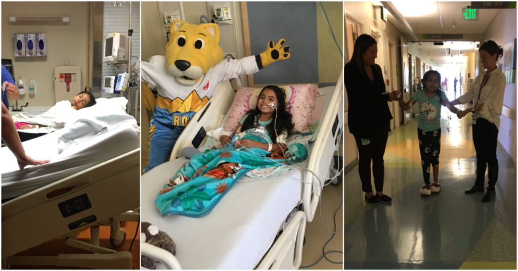 For the next few days, while Bella continued her plasma treatments, I Googled NMO and tried to join as many support groups as possible so I could learn all I could about how it affects the body and how we as a family could help Bella fight together. In my research, I learned that there is no cure for NMO and that most patients only live for 5 years with the disease. I was mortified, but quickly learned by talking to other patients and caregivers that although there is no cure, patients can live a lot longer than 5 years and lead healthy, happy, and full lives. I was thankful for the diagnosis, but also scared of everything I was reading. The next few weeks were quite a roller coaster of emotions. Bella spent nearly 3 weeks in the ICU at Children’s Hospital, and we stood by her side and played music, danced, and brought tons of visitors from family and friends to Rocky, the Denver Nuggets’ mascot! She was a star in the ICU and with doctors. She even had a whole team of doctors and specialists coming to teach medical students about her case.
