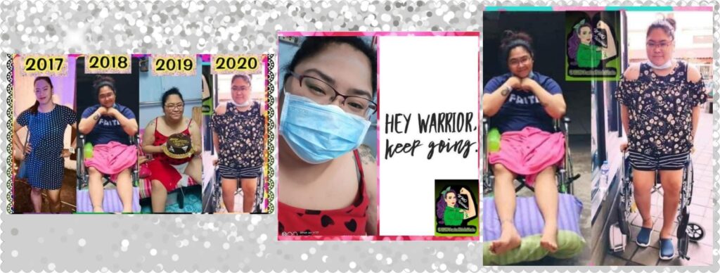 By the time I was in the Rehabilitation (February 2019 – March 2019) at the same hospital my Rehab Doctor (Therapist) told me that my program is only to help me make my upper body part stronger to support my lower limbs because there is no assurance that they can make me walk again. But I said to myself “No! I don’t want to be like this for the rest of my life, I should walk or at least can stand I must regain my sitting balance” then one day I try to move a toe, I always pushed myself to make it move and miraculously “I did!” I don’t know what to feel my heart beats faster and from that day I always pushed myself to try other movements that I can though it is really hard at first”. And as of today by God’s blessing, I can get up on my bed alone, Sit without out balancing, eat on my own, Take a bath myself though still need to lift by my father and boyfriend to get to the bathroom, I can transfer myself from one place to my wheelchair, I can propel on my own and most achievement I have now is I am starting to learn how to Stand and Walk again but due to this CoVid19 Pandemic Crisis I cannot start my Therapy Session.
